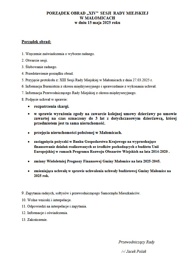 W dniu 15.05.2025 r. o godz. 14.00 w Sali Konferencyjnej Urzędu Miejskiego w Małomicach odbędzie się XIV Sesja Rady Miejskiej w Małomicach. Zachęcamy do śledzenia obrad on-line / zakładka TRANSMISJE Sesji Rady Miejskiej na stronie www.malomice.pl/