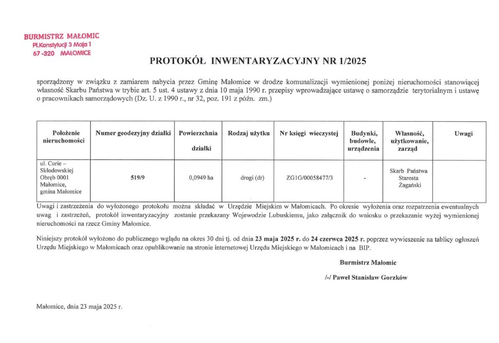 Protokół inwentaryzacyjny sporządzony w związku z zamiarem nabycia przez Gminę Małomice w drodze komunalizacji wymienionej poniżej nieruchomości stanowiącej własność Skarbu Państwa.
