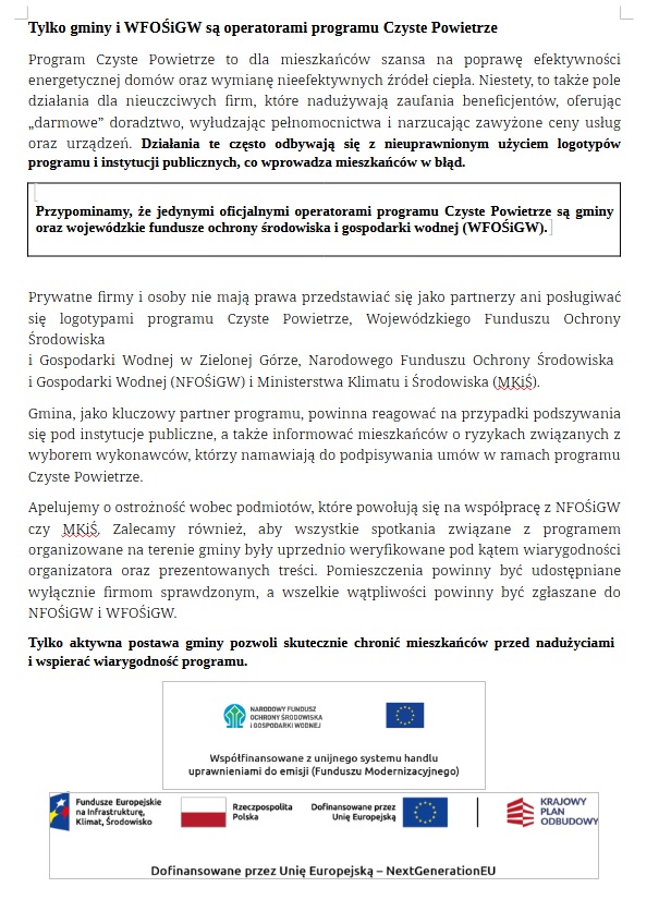 Przypominamy, że jedynymi oficjalnymi operatorami programu Czyste Powietrze są gminy oraz wojewódzkie fundusze ochrony środowiska i gospodarki wodnej (WFOŚiGW).