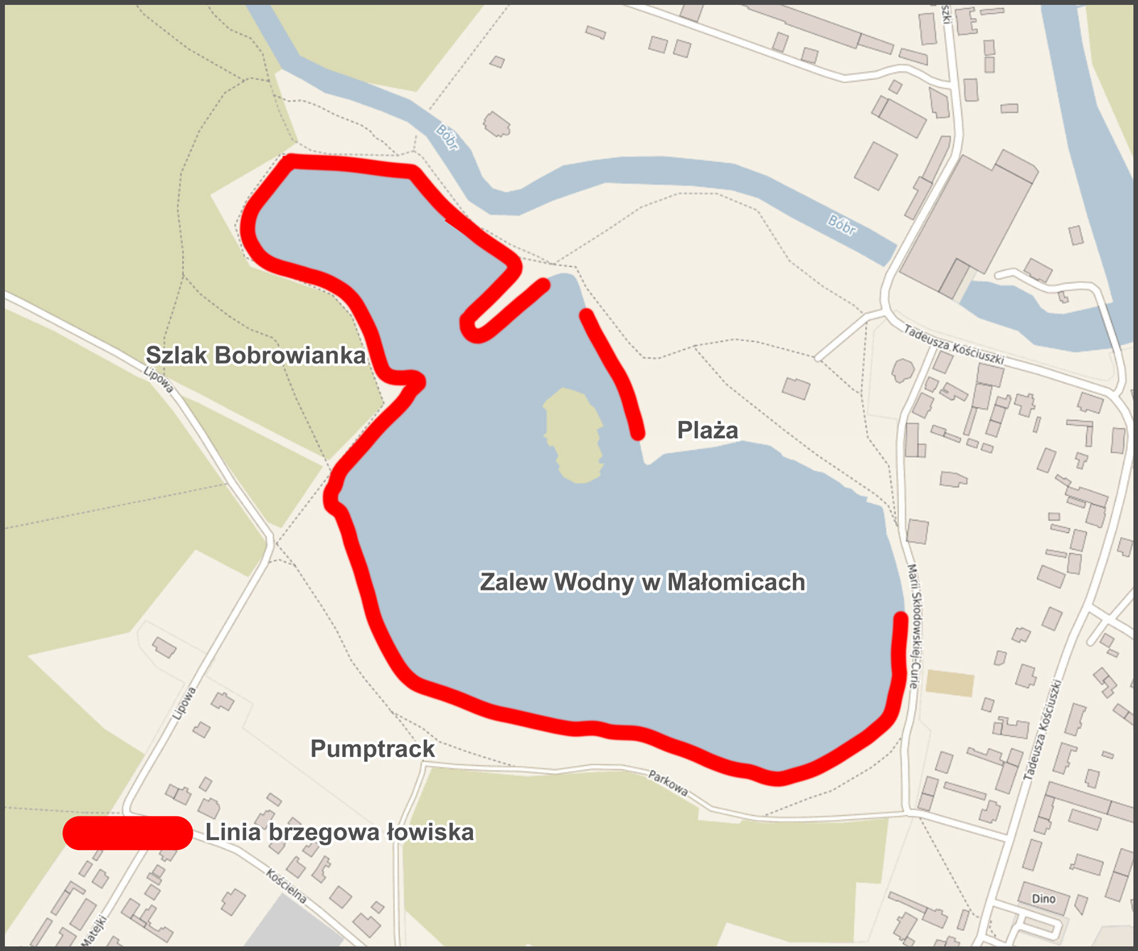 Informujemy, że w sezonie letnim 2025 wyjątkowo nie zostało uruchomione kąpielisko. Przyczyną są trwające prace remontowe ulic Kościuszki i Skłodowskiej-Curie. Plac parkingowy przy zalewie został przeznaczony na składowisko materiałów budowlanych, a wzdłuż akwenu prowadzony jest objazd remontowanego odcinka ul. Kościuszki. Zwiększony ruch pojazdów w bezpośrednim sąsiedztwie zbiornika uniemożliwił zorganizowanie bezpiecznego, strzeżonego kąpieliska.